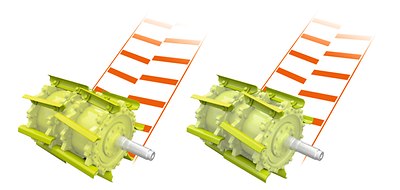 Bębny nożowe V-MAX umożliwiają poszerzenie spektrum długości cięcia. Zbieranie z długością cięcia wynoszącą 30 mm jest możliwe również z Corncrackerem. W przypadku V-MAX 36 / 28 / 24 wystarczy po prostu przestawić dźwigary noży i podzielić liczbę noży na pół. Uzyskany symetryczny zrzut materiału zapewnia wysoką niezawodność użytkowania i bardzo równomierne kondycjonowanie za pomocą Corncrackera.