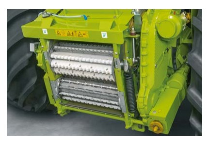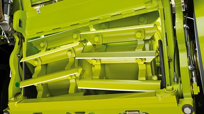 Tylny górny walec wstępnego prasowania naciska na zbierany materiał za pośrednictwem dwóch siłowników hydraulicznych z akumulatorami ciśnieniowymi. Dzięki specjalnej charakterystyce siła zgniatania wstępnego dopasowuje się automatycznie do różnych rodzajów zbieranego materiału i zmiennej grubości warstw materiału.