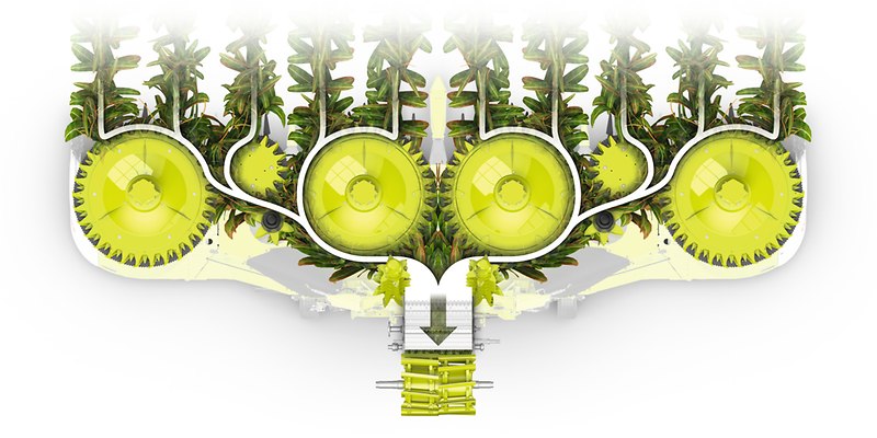 Połączenie małych i dużych tarcz wciągających umożliwia pracę w różnych warunkach z niezwykle dużą przepustowością. ORBIS łagodnie i bezpiecznie transportuje wszystkie rośliny, aby optymalnie doprowadzić je do wlotu JAGUAR. Podczas rewersowania pocięte już rośliny pozostają na dużych tarczach i są następnie wciągane.