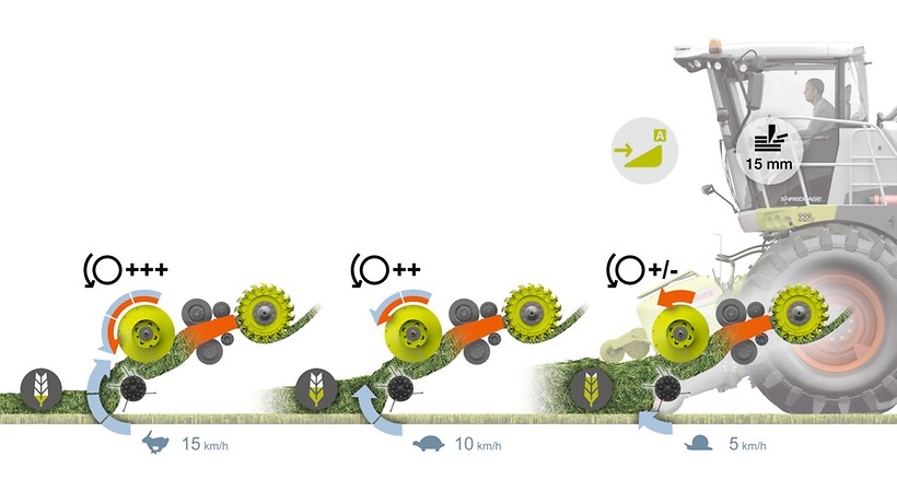 napęd wciągania, liczba obrotów bębna, przyspieszacz i Corncracker mogą w takim samym stopniu reagować na wahania liczby obrotów. Korzyść: zawsze stała długość sieczki.
