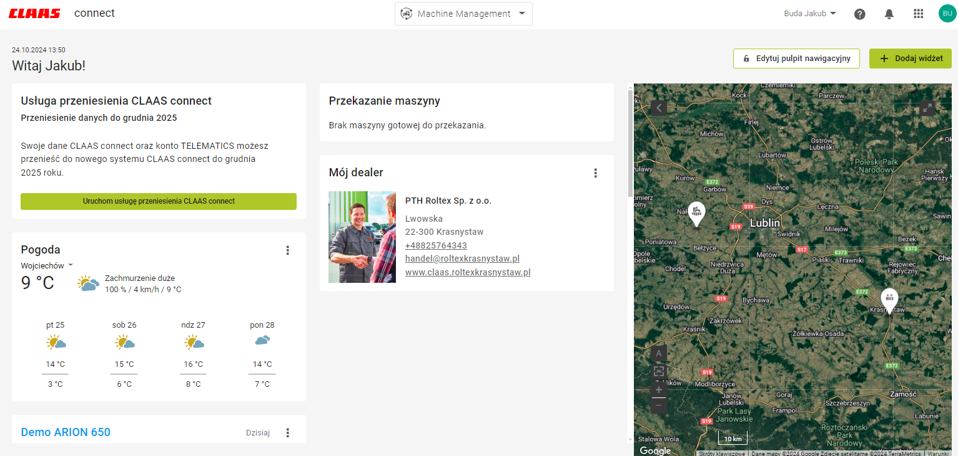 12. Po zakończeniu powyższego procesu należy jeszcze raz zalogować się do CLAAS connect. Wtedy ukaże się taki widok pulpitu.