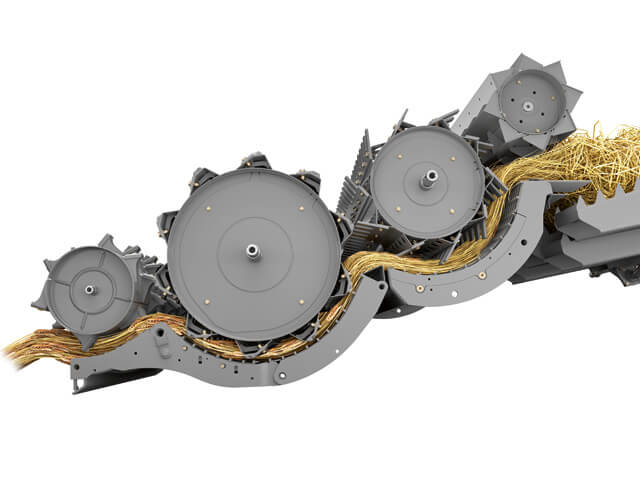 Liczy się każde ziarno. Ułożyskowane mimośrodowo, wysokowydajne rotory ROTO PLUS generują ogromne siły odśrodkowe umożliwiające oddzielenie pozostałych ziaren od słomy. Średnica 445 mm oraz długość 4200 mm zapewniają bardzo dużą powierzchnię separacji.
