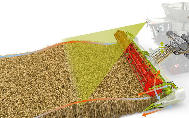 Czujnik FIELD SCANNER rejestruje wysokość roślin, a czujnik wysokości warstwy w kanale wciągającym analizuje przepływ materiału. Dane te są wykorzystywane przez CEMOS AUTO HEADER do aktywnej regulacji położenia nagarniacza i stołu przyrządu żniwnego VARIO. Takie rozwiązanie zapewnia wyraźne odciążanie operatora i optymalne wciąganie zebranego materiału w każdej sytuacji.