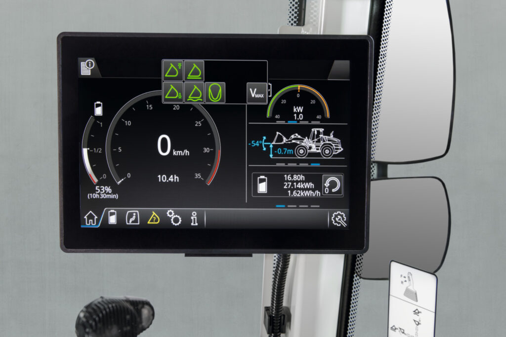 Przestronna kabina z ergonomicznym stanowiskiem operatora, dużą przestrzenią nad głową i na nogi oraz doskonałą widocznością przez panoramiczne okna, zapewnia komfort nawet podczas długiej pracy. Terminal dotykowy umożliwia szybki przegląd parametrów maszyny, stanów akumulatora i prognozy czasu ładowania.