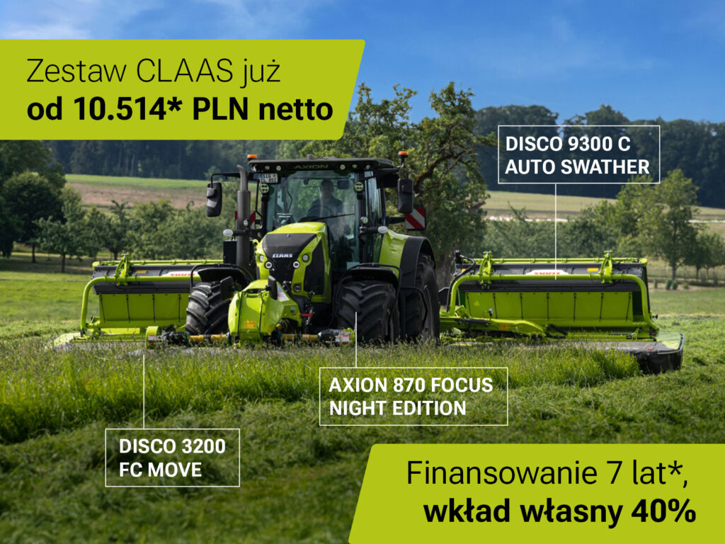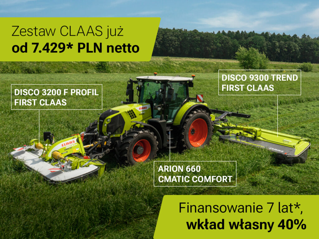 * Propozycja obejmuje możliwość skorzystania z finansowania udzielanego przez CLAAS FINANCIAL SERVICES SAS SPÓŁKA AKCYJNA UPROSZCZONA ODDZIAŁ W POLSCE („CFS”) w formie pożyczki na okres 7 lat, minimalny wkład własny Klienta 40% wartości netto maszyny. Propozycja finansowania dotyczy fabrycznie nowych modeli ciągników CLAAS ARION 660 CMATIC COMFORT (C25ZZA6Z) wraz z kosiarkami CLAAS DISCO 9300 TREND FIRST CLAAS (CDWD9G35) oraz CLAAS 3200 F PROFIL FIRST CLAAS (CDWD9G35) zwanych dalej „Zestaw 1” lub ciągników CLAAS AXION 870 FOCUS NIGHT EDITION (CX9VX7VG) wraz z kosiarkami CLAAS DISCO 9300 C AUTO SWATHER (C36PNWP6) oraz CLAAS DISCO 3200 FC MOVE (C36PNWP6) zwanych dalej „Zestaw 2”, zamówionych przez Klientów u Autoryzowanych Dealerów marki CLAAS po 1 listopada 2025 r. i jest adresowana wyłącznie do przedsiębiorców. Przykładowo oznacza to, że dla Zestawu 1 przy założonej orientacyjnej i niewiążącej cenie końcowej dla Klienta w wysokości 875 990,00 PLN netto, przewidziano 83 raty miesięczne w wysokości 7 429,00 PLN oraz dla Zestawu 2 przy założonej orientacyjnej i niewiążącej cenie końcowej dla Klienta w wysokości 1 240 132,00 PLN netto, przewidziano 83 raty miesięczne w wysokości 10 514,00 PLN (odchylenia w zakresie specyfikacji lub roku produkcji poszczególnych maszyn mogą skutkować odpowiednimi różnicami w wysokości raty). Opłata manipulacyjna wynosi 0,5% wartości netto maszyny. Podatek VAT finansowany do 4-ego miesiąca. Powyższe warunki zostały przygotowane w oparciu o stałą stopę procentową. Propozycja nie stanowi oferty w rozumieniu art. 66 §1 Kodeksu Cywilnego i może być jednostronnie odwołana przez CFS w każdym czasie, przy czym jednocześnie zachowuje aktualność maksymalnie do 31 stycznia 2026 r. CFS zastrzega sobie prawo do przedłużenia propozycji. Finalne warunki finansowania mogą być uzależnione od zdolności kredytowej Klienta ocenianej przez CFS i różnić się od przedstawionych w ofercie. W każdym przypadku warunki te zostaną końcowo uregulowane w zawartej umowie o finansowanie. Szczegóły propozycji można uzyskać u Regionalnych Kierowników Sprzedaży CFS oraz Autoryzowanych Dealerów CLAAS Polska sp. z o.o.. Propozycja jest ważna pod warunkiem dostarczenia przez Klienta wszystkich informacji i dokumentów wymaganych przez CFS celem skompletowania wniosku o finansowanie (zgodnie z obowiązującą w CFS procedurą weryfikacyjną, w szczególności obejmującą zbadanie zdolności finansowej Klienta w zakresie spłaty zaciąganego zobowiązania).
