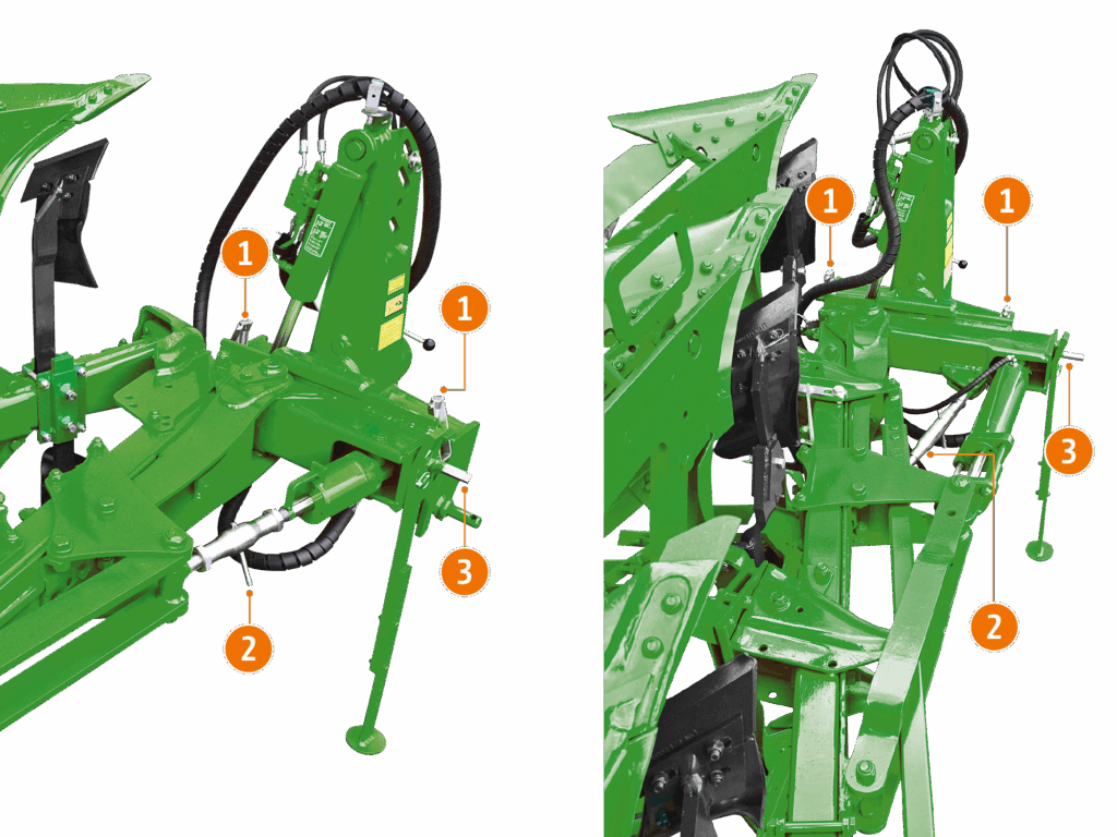Wszystkie wieże mocujące posiadają podłużne otwory do mocowania łącznika górnego, które umożliwiają optymalne dopasowanie kombinacji pługa i ciągnik do nierównego podłoża.