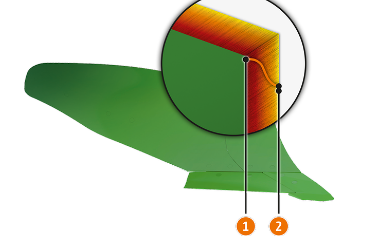 Nowy korpus pługa SpeedBlade z opatentowaną, bardzo dużą przednią częścią odkładnicy i procesem hartowania ©plus zapewnia znacznie mniejsze zużycie przy dużych prędkościach roboczych. Ze względu na coraz większe prędkości robocze podczas orki, punkt zużycia przesuwa się bardziej do tyłu. Ze względu na małą przednią część odkładnicy w dostępnych w handlu korpusach pługa, przy wyższych prędkościach zużycie rozpoczyna się bezpośrednio na odkładnicy.
