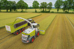 Materiał podawany jest do systemu omłotowego poprzez przenośnik pochyły. Przenośnik łańcuchowo-listwowy w przenośniku pochyłym odbiera materiał z przyrządu żniwnego i musi być w stanie zapewnić