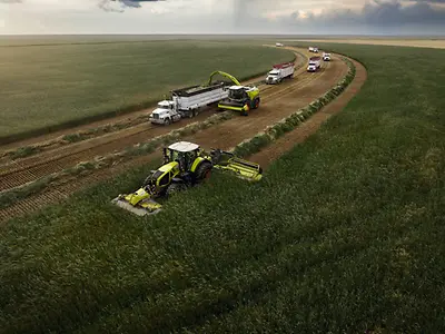 Zegar tyka. Ponad 30 ciężarówek transportowych podąża w niewielkich odstępach za sieczkarnią JAGUAR 1200. Co 2 minuty i 42 sekundy z pola zjeżdża naładowany do pełna pojazd. Zespół działa jak w zegarku: AXION z kosiarką DISCO kosi, JAGUAR sieka, a XERION ugniata.