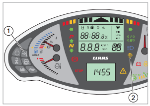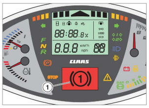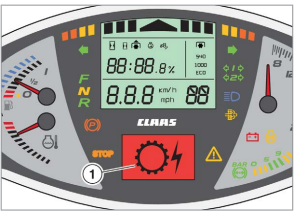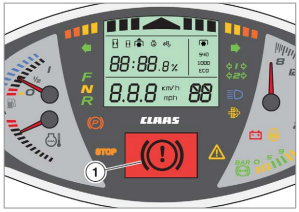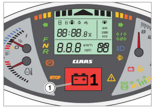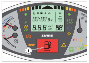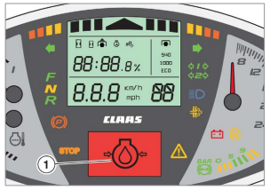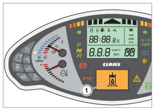 Gdy poziom płynu hamulcowego jest zbyt niski, na wyświetlaczu pojawia się ikona (1). Należy natychmiast zatrzymać ciągnik i skontaktować się z profesjonalnym warsztatem specjalistycznym.
