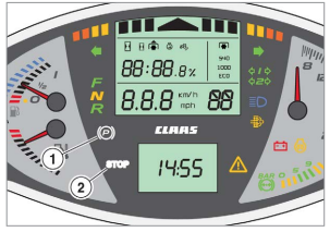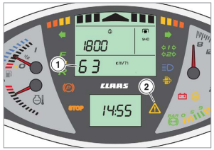 ► Główny wyświetlacz pokazuje prędkość (1) ciągnika. Wartość prędkości (1) ciągnika miga.
