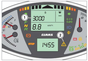 Miga wartość prędkości obrotowej silnika (1). Kiedy prędkość obrotowa silnika ponownie spada do normalnych wartości, następuje wyłączenie alarmu. Główny wyświetlacz nadal pokazuje wartość prędkości obrotowej silnika.