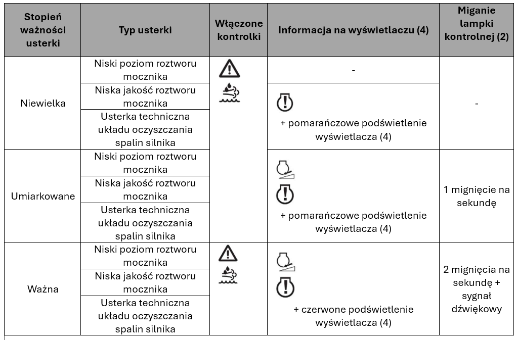 Kiedy występuje usterka układu oczyszczania spalin silnika, użytkownik jest ostrzegany przez zaświecenie się kontrolek na tablicy wskaźników i przez wyświetlenie informacji na ekranie komunikatów zdarzeń. Silnik działa wtedy w trybie awaryjnym i parametry pracy silnika są automatycznie obniżane. Skontaktować się jak najszybciej z profesjonalnym warsztatem specjalistycznym.