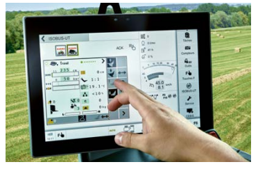 Ciągniki CLAAS z terminalem obsługowym CEBIS Touch działają również z ISOBUS. Dzięki zintegrowanemu sterowaniu urządzeniami ISOBUS możliwe jest wyświetlanie, a także obsługa wszystkich funkcji. Korzystając z przycisków funkcyjnych na drążku CMOTION ciągnika można ponadto aktywować i dezaktywować maks. dziesięć funkcji ISOBUS.