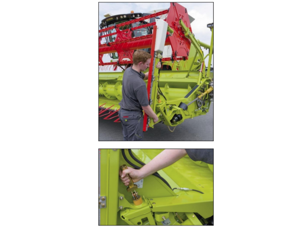 - Zablokuj blokadę bezpieczeństwa w górnej części przyrządu żniwnego